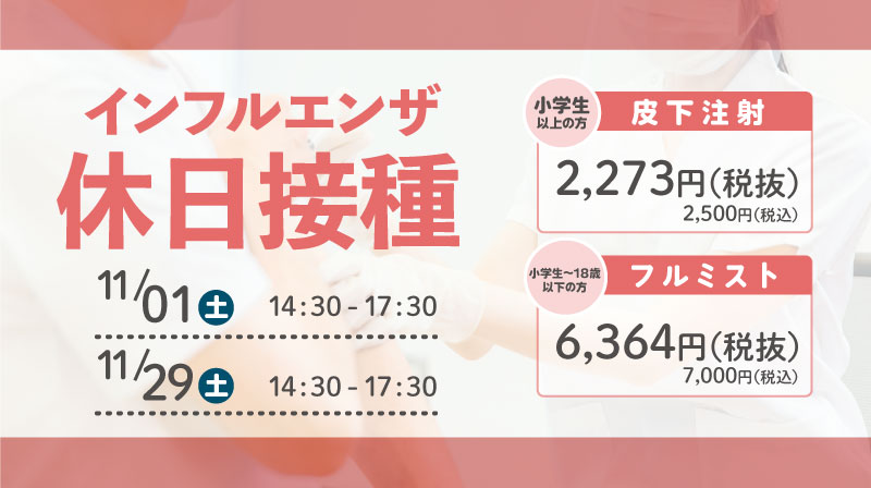 下記の日時で「インフルエンザ皮下注射」および「経鼻インフルエンザワクチン(フルミスト)」の接種を行います。